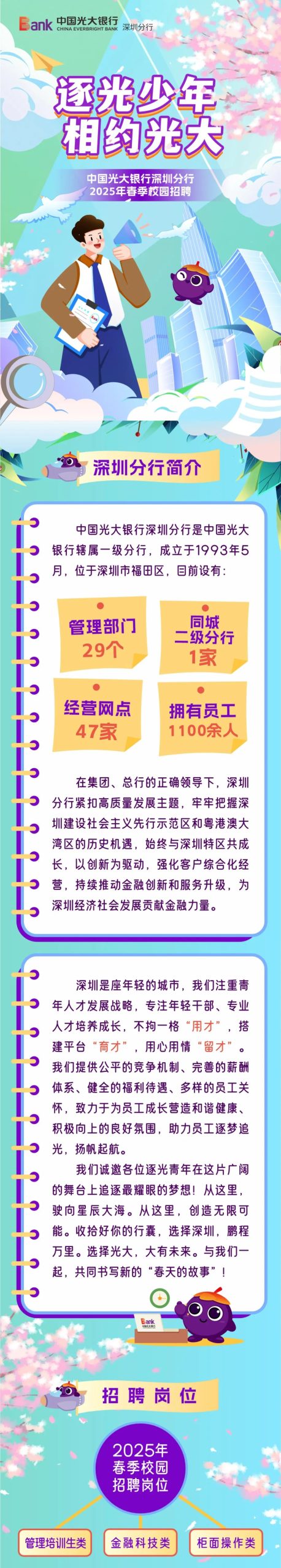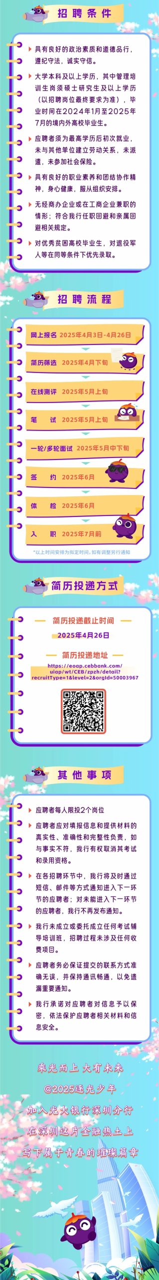 中国光大银行深圳分行2025年春季校园招聘 本地网整理 • 2025年5月22日 下午4:38 • 招聘, 银行 • 阅读 16 学习最新考试技巧,掌握考试必备知识。 高效备考,轻松应对各类考试! 提升考试成绩,获得理想结果。 赞 (0) 本地网整理 0 生成海报 广发银行深圳分行社会招聘公告 上一篇 2025年5月22日 下午4:38 龙岗区投控集团关于2025年粮食公司招聘公告 下一篇 2025年5月22日 下午4:38 相关推荐 事业单位 深圳大学未来地下城市研究院招聘辅助管理人员启事 深圳大学未来地下城市研究院招聘辅助管理人员1名。岗位职责包括行政、实验室、网站公众号运营、宣传设计及财务等工作。要求本科以上学历,精通办公软件、PS、视频剪辑及摄影。提供有竞争力的薪酬待遇。欢迎符合条件者投递简历。 2025年10月31日 招聘 深圳长虹聚和源科技有限公司关于招聘操作工的公告 深圳长虹聚和源科技有限公司,隶属于北交所上市公司长虹能源(836239),专注于聚合物锂离子电池研发、制造和销售。该公司是国家级高新技术企业、深圳市“专精特新企业”,并参与制定国内智能穿戴和电子烟电池行业标准。公司拥有深圳和湖南两大生产基地,年产能超过1亿只聚合物锂离子电池,为智能时代提供能源解决方案。目前招聘操作工30名,要求初中及以上学历,工作地点位于深圳。有意者请联系:0755-84516700 或 13714627674。 2024年6月24日 招聘 迅雷实习生招聘申请:快速入口 寻找深圳地区实习岗位?选择工作地点和职位性质并点击进入,即可浏览最新岗位和要求,还可投递简历。请注意以官网时间为准。 2024年5月11日 招聘 深圳市高级中学高中园2025年1月面向社会公开选聘教师公告 深圳高级中学高中园2025年公开招聘教师,面向社会公开选聘6名教师。 需符合相关学历、学位、专业、教师资格证等要求,并具备良好的政治素质和道德品行。 报名时间:2025年1月8日至14日。 2025年1月3日 招聘 深圳实验幼儿园招聘公告 深圳实验幼儿园招聘:各岗位需求及条件,1988年创办,省一级幼儿园,诚聘专任教师、体育专教、特教老师、保健员及保育员。 2025年6月9日 医疗 深圳市罗湖区英达幼儿园招聘公告 抱歉,您提供的文本似乎是一段SVG路径代码,不包含任何可读的实际内容。我无法基于这段代码生成有意义的元描述。 请您提供实际的文本内容(例如文章、产品介绍或网页正文),我将很乐意为您撰写一个精准且利于SEO的元描述。 2025年10月15日 公益岗 深圳市龙岗区宝龙街道悦龙幼儿园招聘启事 深圳悦龙幼儿园招聘面点师及实习生,提供多元化教学环境和宽敞活动场地。 欢迎符合条件者报名! 2025年8月29日 招聘 深圳理工大学药学院殷勤课题组2024年博士后招聘启事 招聘岗位 博士后(2-3名) (一)应聘条件 1、取得国内外知名高校博士学位或已通过博士学位答辩者; 2、即将取得博士学位或取得博士学位不超过3年,年龄原则上不超过35周岁;未在广… 2024年6月22日 医疗 深圳市康宁医院招聘30人公告(2025年1月批次) 深圳康宁医院招聘公告:三甲精神病专科医院诚聘多岗位,2025年1月31日前报名。 2025年1月11日 事业单位 深圳市坪山区卫生健康局2024年面向全国公开招聘2名总会计师公告 深圳市坪山区卫生健康局现招聘2名总会计师,要求候选人具备中华人民共和国国籍,政治责任感和职业道德,熟悉财经法规和卫生经济管理能力,以及良好的组织和领导能力。候选人需要具备近5年在财务、会计、审计、财税等领域工作的经验。此次招聘面向全国公开,有意者可查看官方网站获取更多信息。 2024年3月5日 发表回复 您的邮箱地址不会被公开。 必填项已用 * 标注*昵称: *邮箱: 网址: 记住昵称、邮箱和网址,下次评论免输入 提交
