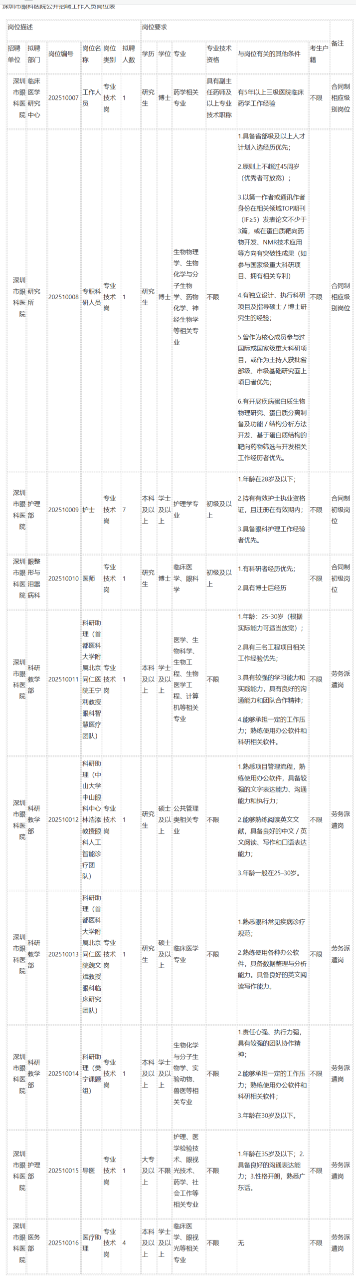 附件:深圳市眼科医院公开招聘工作人员岗位表